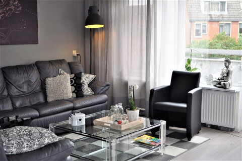 Prachtige lichte woonkamer voorzien van een mooie laminaatvloer en toegang tot het balkon; mooie open keuken en toegang tot het 2e zonnige balkon.