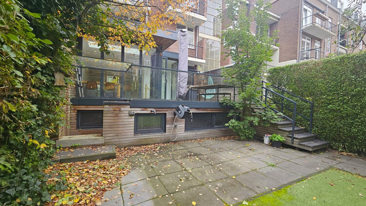 Inside, you’ll find a beautifully designed and fully furnished home, spread over the beletage (raised ground floor). The spacious hallway with built-in storage leads to a modern kitchen, fully equipped with all conveniences. From here, you step directly into the outdoors: a fantastic 90 m² garden, featuring an elevated terrace and a lower-level area with artificial grass – perfect for sunny afternoons or relaxed evenings outside.